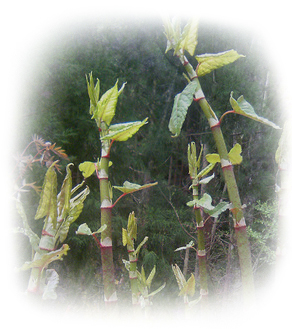 Legend and Lore It is one of the first plants to appear in the springtime; a highly pervasive and invasive member of the buckwheat family. Polygonum – refers to the many jointed stem or swollen stem nodes, Cuspidatum –from the Latin cusp referring to the leaf’s sharp pointed tip. In Asia during World War II the leaves were dried and used as a substitute for tobacco. The Iroquois used it to rub down their horses to keep the flies away; the Elizabethan thought that by eating the knotweed it would stunt their growth! An extract made from knotweed and oak bark was used as substitute to Quinine (anti-malaria), knotweed has also been reported in some cancer treatment. Considered a rhubarb substitute it should be harvested when smaller than 30cm in height in the spring; then it morphs into a solid bamboo thicket too though to eat! In the Garden Disturbed wasteland, roadsides; forms large colonies of upright stems 75cm to 3m, smooth, mottled reddish-purple and often branching, hollow except at the nodes; reproducing by aggressive underground rhizomes - perennial bully. Leaves alternate, simple, 10 to 16cm in length, 10-16cm wide, broadly ovate, wavy margin. Flowers are small individual but numerous, forming a greenish white panicle from the axils of the upper leaves from July to September and rarely producing seeds. |