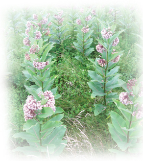 Legend and Lore The genus name asclepias refers to the Greek mythical god of medicine Asclepius, syriaca originally thought from Syria but later rectified and the species name did not change. The confusion stems from another species found in Syria. Milkweed gets its name from the milky sap that seeps out of broken leaves and stems; the medicinal properties of the sap include salves for cuts, burns, infections and irritations. Samuel de Champlain first noticed the plant near Québec City around 1600. The only food for the Monarch caterpillars, milkweed is essential for their annual migration from Mexico. The seed silk was used to stuff pillows, mattresses and woven into cloth fibers. During World War II the seed silk was used to stuff lifejackets. In the Garden Tall perennial up to 2 m in height, leaves are opposite pairs on a single stock measuring 10 to 23cm in length and 5 to 10cm in width on short petioles. Leaves are ovate with a smooth margin, thick but not succulent; pubescent plant with a soft feel, light green with grey down on the underside. The milky sap is latex which flows in copious amounts when bruised. Flowers are pinkish umbels in singles or pairs on the upper third of the plant, with 5 reflexed petals. Pods are elongated, broadest near the base and tapering into a curved point measuring 8 to 14cm. Propagation is by seed or basal cuttings in the spring, or root cutting in the spring or fall. |