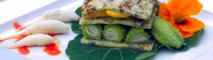 Instructions • Filling Bring water to boil in a heavy sauce pan - parboil pods for 1-2 minutes, drain, cut in Rondelle – large enough to stand, set aside In sauté pan add butter, on moderate high heat, add onions and squash Season with rosemary, thyme, salt and pepper Sauté until soft, Set aside. Ingredients • Roasted Red Pepper Coulis