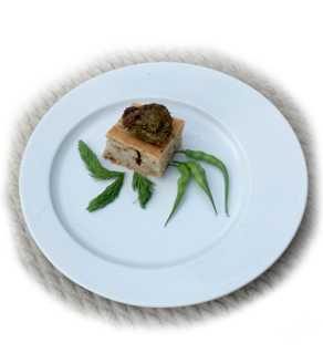 Wild Game Kabob crusted in Spruce Shoots on Focaccia